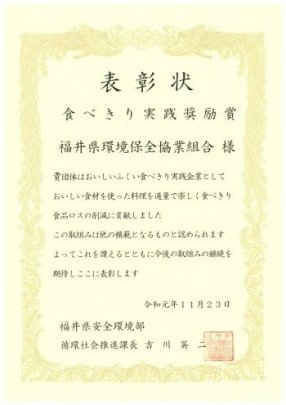11月23日(土)に福井県産業会館で開催された「ふるさと環境フェア2019」において、食べきり運動を実践した企業として表彰を受けました。